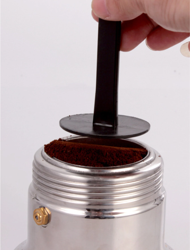 - أداة عملية تجمع بين المعلقة لقياس البن والضغاطة لتهيئته داخل البورتافلتر.